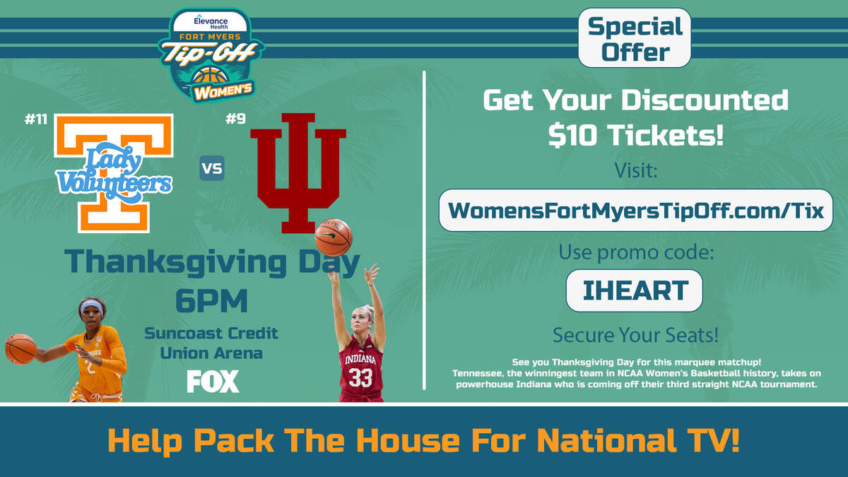 The Indiana Lady Hoosiers tip off against the Tennessee Lady Volunteers at 6pm Thursday November 23rd at 6pm at the WOMEN'S FORT MYERS TIP-OFF. Tickets are now on sale but you can purchase tickets for only $10 when you use the special promo code "IHEART" Eat an early Thanksgiving meal and come be a part of this nationally televised event.
